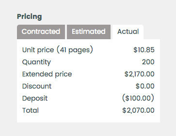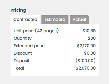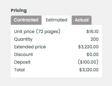 You can see the original contract price, any estimated price you would like to calculate, and the actual book price as you work on your project keeping you aware of cost changes at all times.